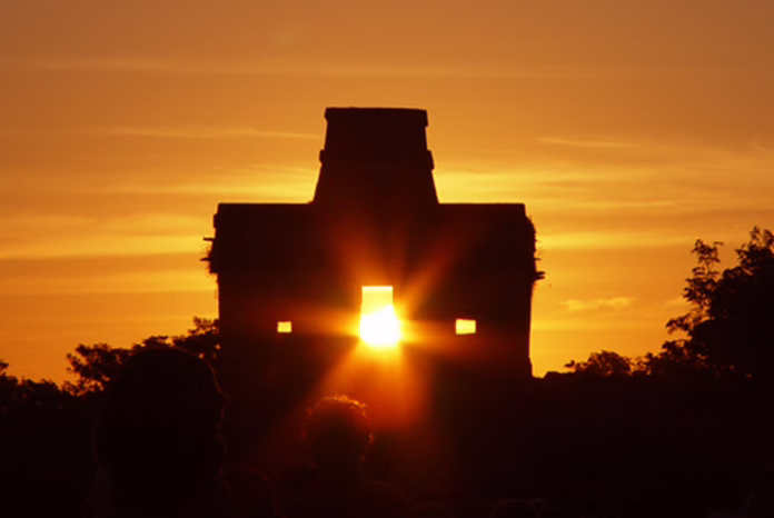 En Dzibilchaltún, el Templo de las Siete Muñecas se convierte en un portal de luz al amanecer del equinoccio. La estructura fue construida de manera que el sol, al salir, se alinee perfectamente con su puerta, creando una imagen espectacular: el astro parece surgir desde el interior del templo.