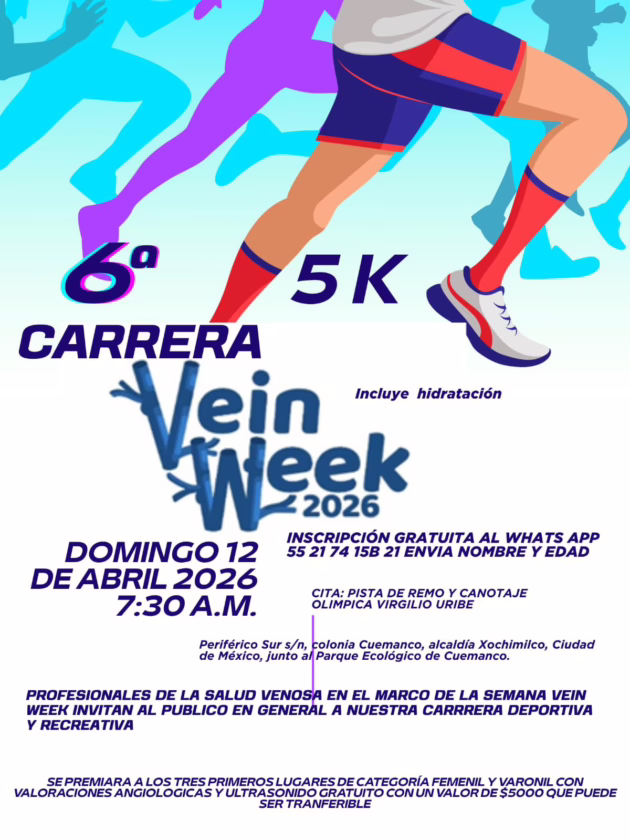 Si quieres tener la oportunidad de ganar una valoración angiológica y ultrasonido gratuitos, con un valor de $5 mil pesos,  participa en la 6ª Carrera Vein Week 2026, este domingo 12 de abril en la pista de Cuemanco, Ciudad de México. Los 3 primeros lugares en las categorías femenil y varonil, recibirán como premio esas valoraciones médicas.